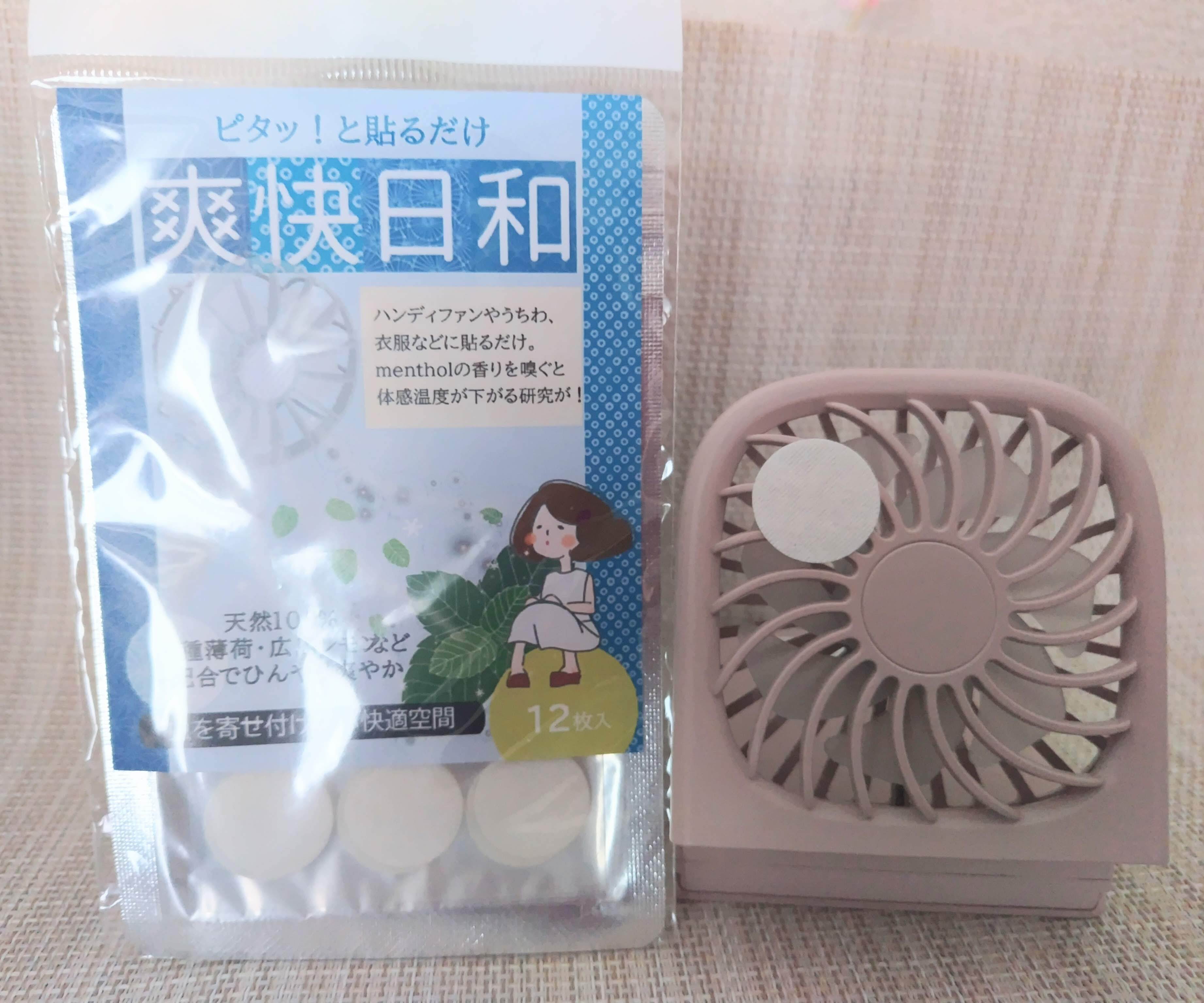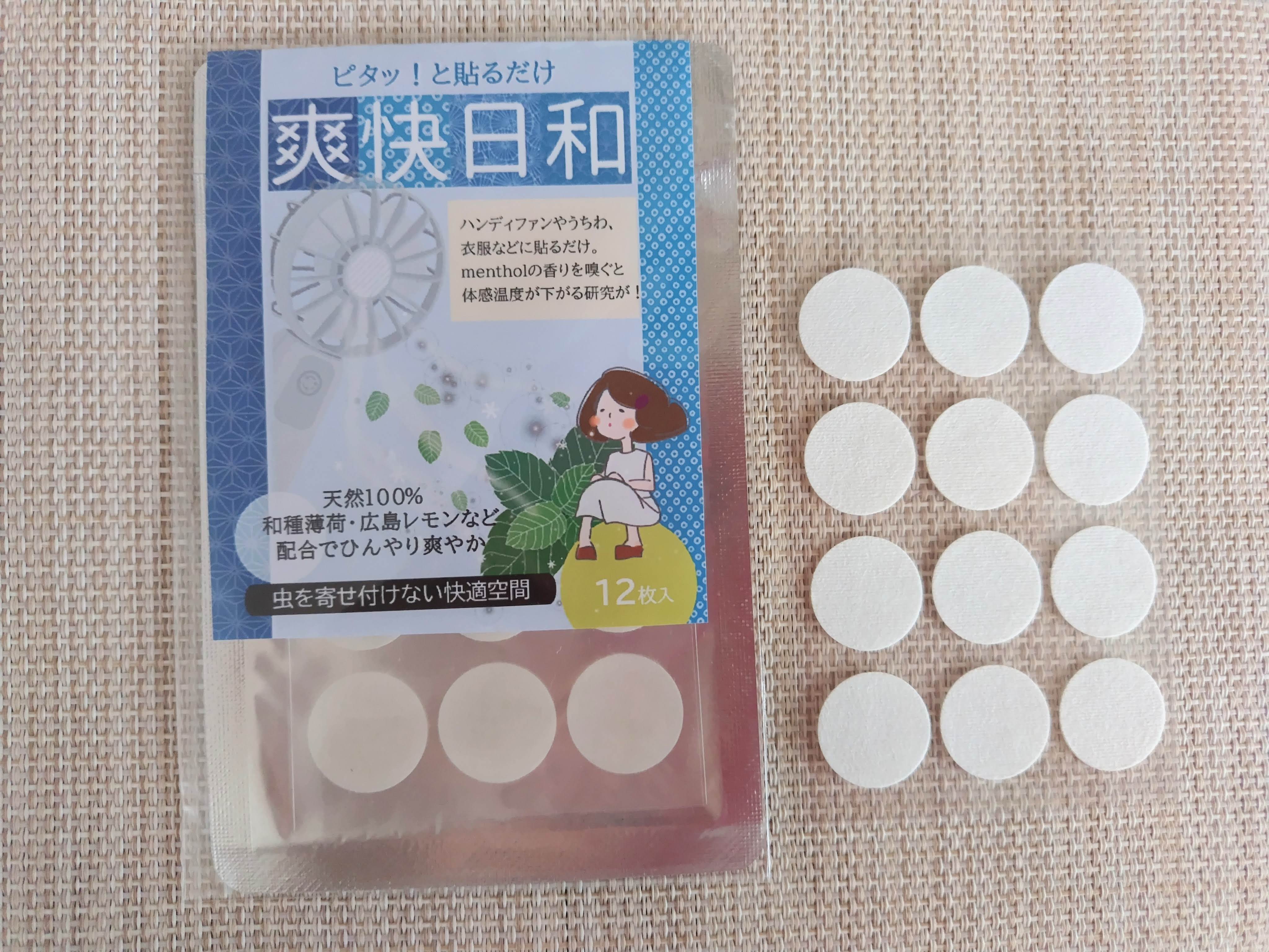 「爽快日和」アロマシールは、ハンディファンやうちわに貼るのがおすすめです。大阪万博でも販売されています(大阪万博会場内は12枚入で販売中)