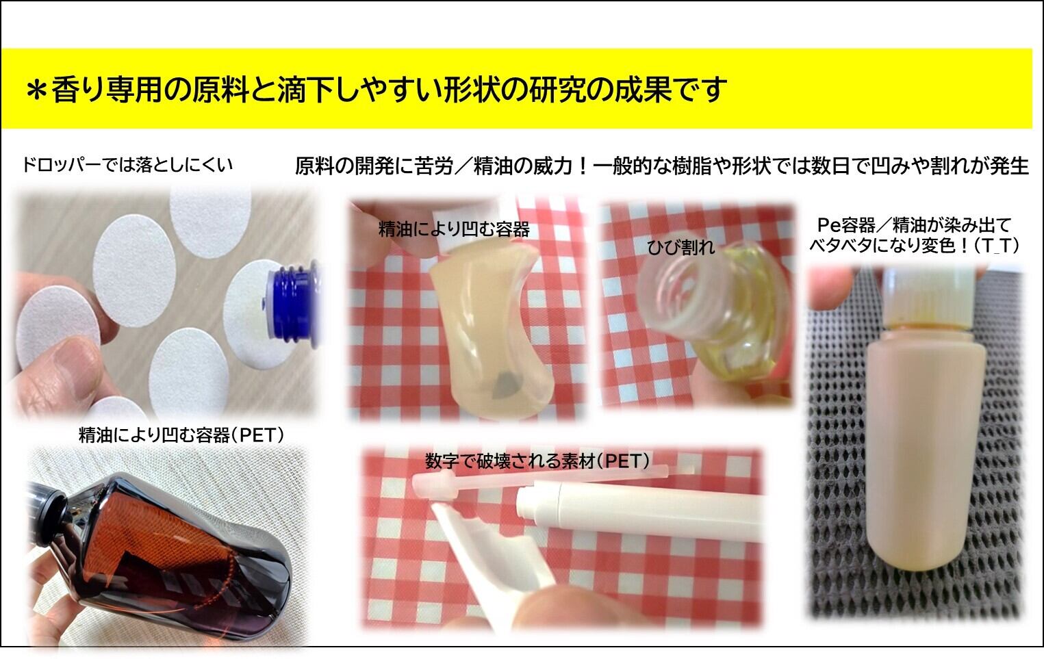 精油の成分に強い素材で作られており、一般的に樹脂では不可能であった容器の変質やにおい移りを防ぎます。