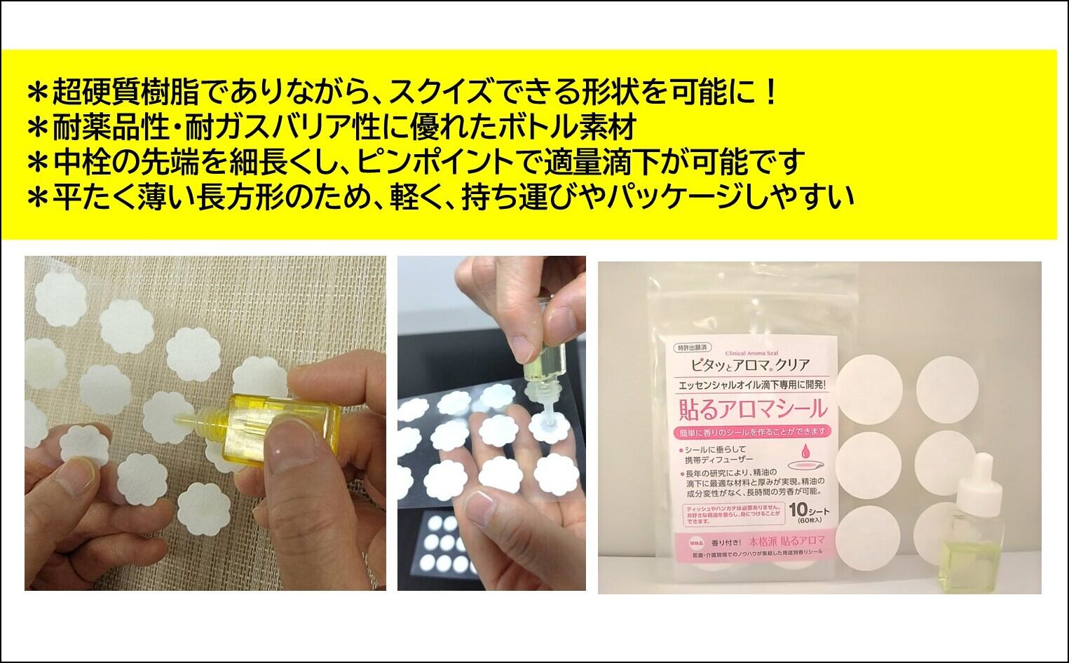 精油の成分に強い素材で作られており、一般的に樹脂では不可能であった容器の変質やにおい移りを防ぎます。